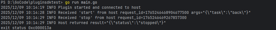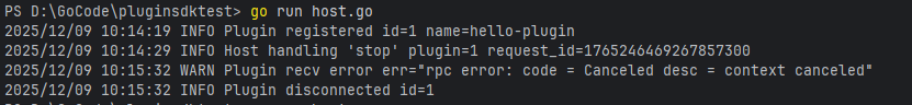 hostSDK.Stop() // 停止Host服务,断开与插件的连接插件通过<font style="color:rgba(0, 0, 0, 0.85) !important;">defer sdk.Close()</font>关闭连接。