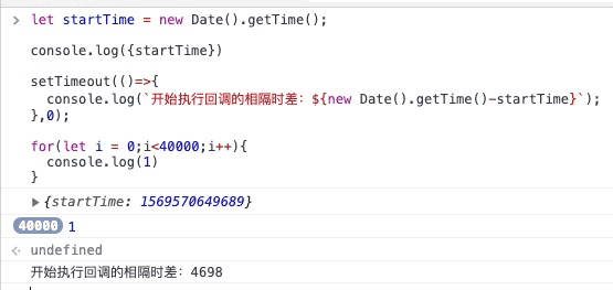 console.log(`开始执行回调的相隔时差:${new Date().getTime()-startTime}`);