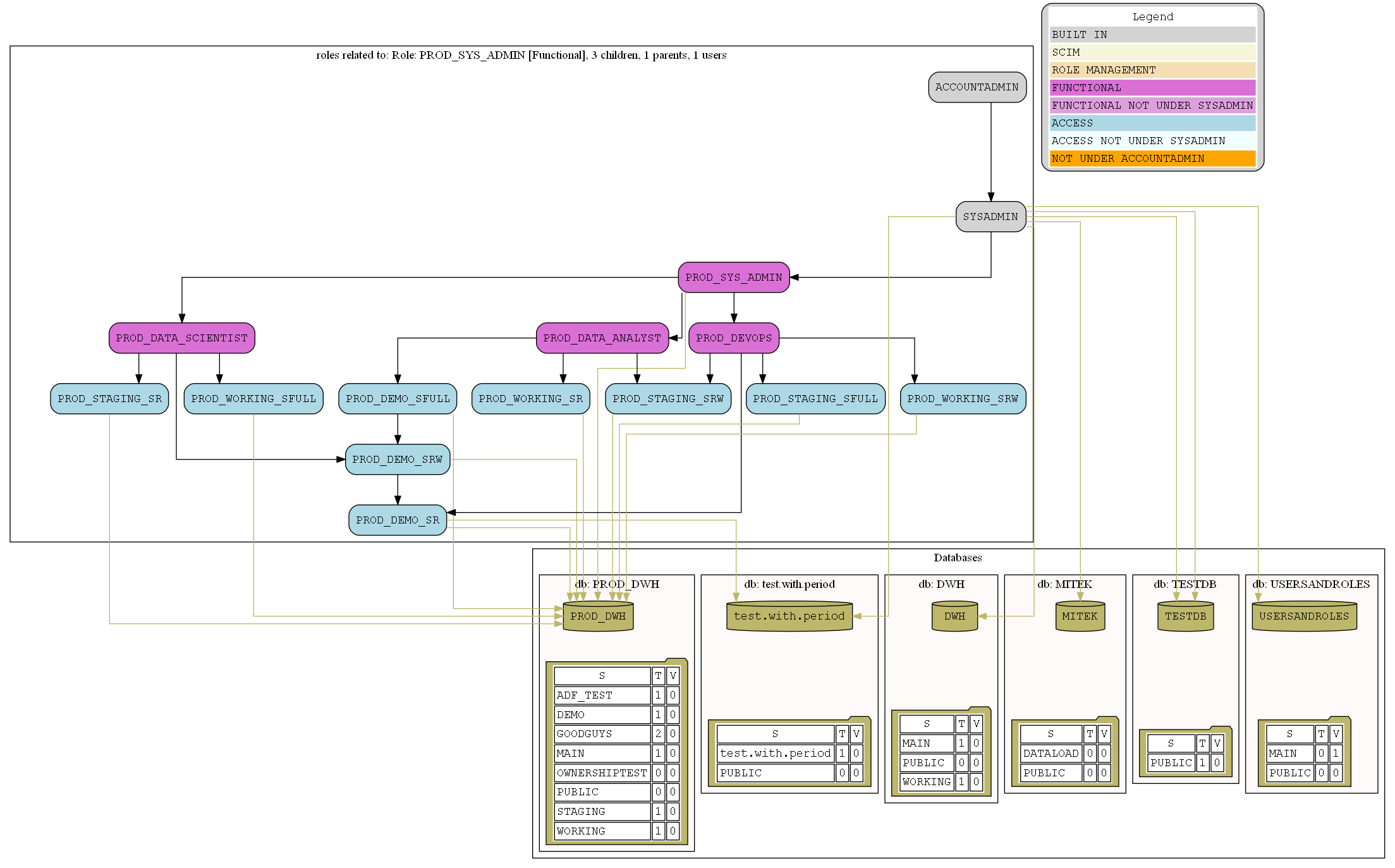 Visual representation of Role hierarchy and databases used by those Roles, with Roles color-coded to their type and location within the hierarchy, offering online graph visualization as well PNG, SVG and PDF versions.