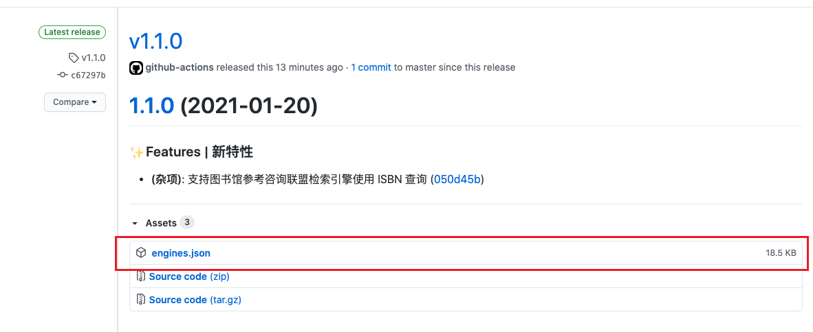 方法二:点击右侧 Releases 最新版,然后点击 engines.json 进行下载。