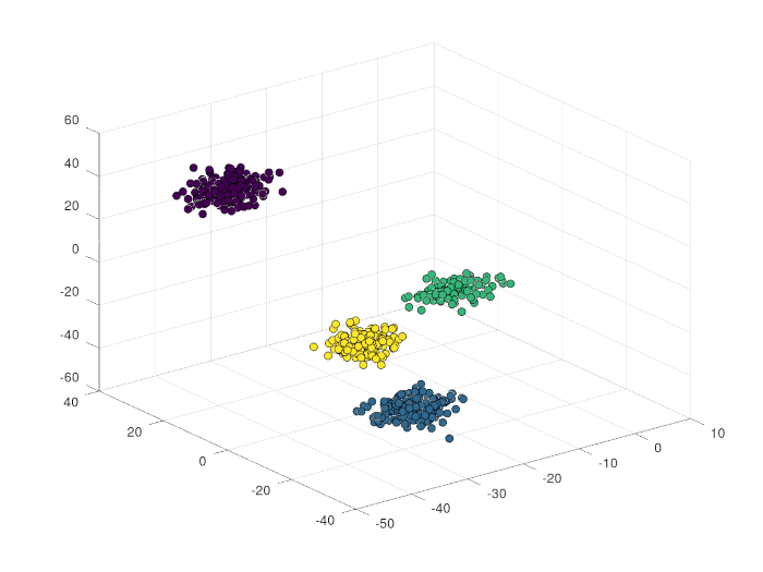 >> scatter(o.points(:, 1), o.points(:, 2), 36, o.clusters, 'filled', 'MarkerEdgeColor', 'k');>> o = clugen(3, 4, 1000, [1 0 0], pi / 8, [20 15 25], 16, 4, 3.5, 'seed', 123);