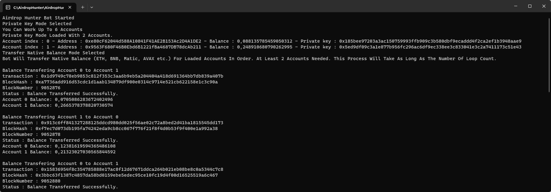 The bot can transfer in ZkSync, LayerZero, Base, Linea and PolygonzkEVM. Software designed to automate the process of participating in airdrops, making it easier for users to receive airdropped tokens across various platforms. It might help users find and participate in airdrops, manage multiple wallet addresses, and keep track of their airdrop rewards efficiently.