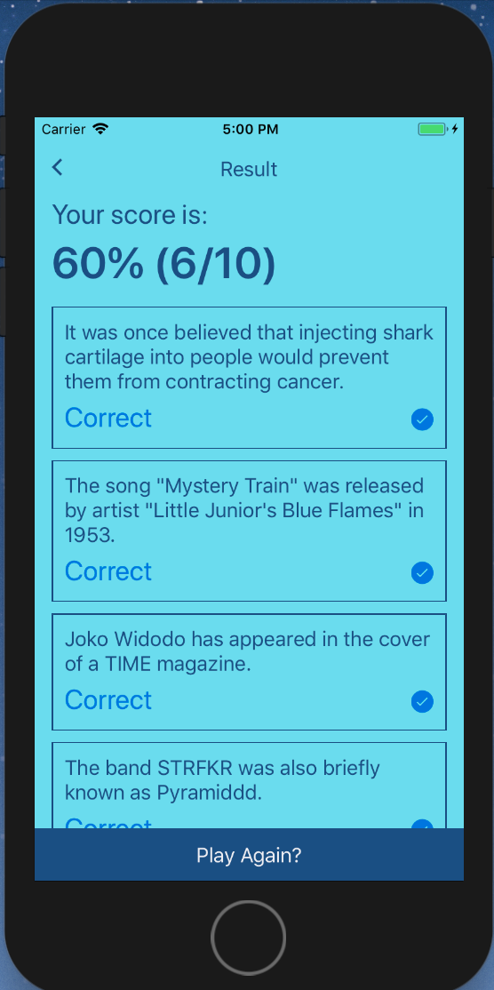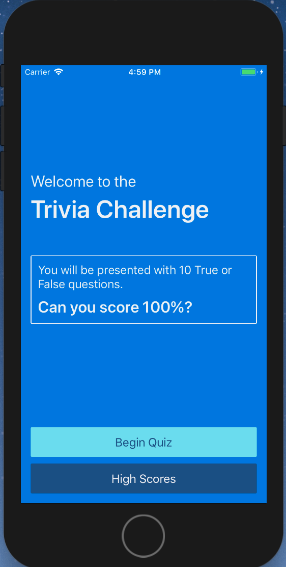 Mobile application for taking a quiz of 10 True/False questions against OpenTrivia DB (https://opentdb.com). It's built using