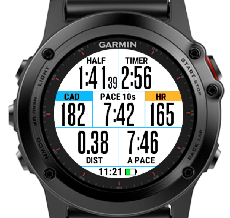 Connect IQ DataField for the Fenix3 watch meant to be used while racing a Half Marathon.