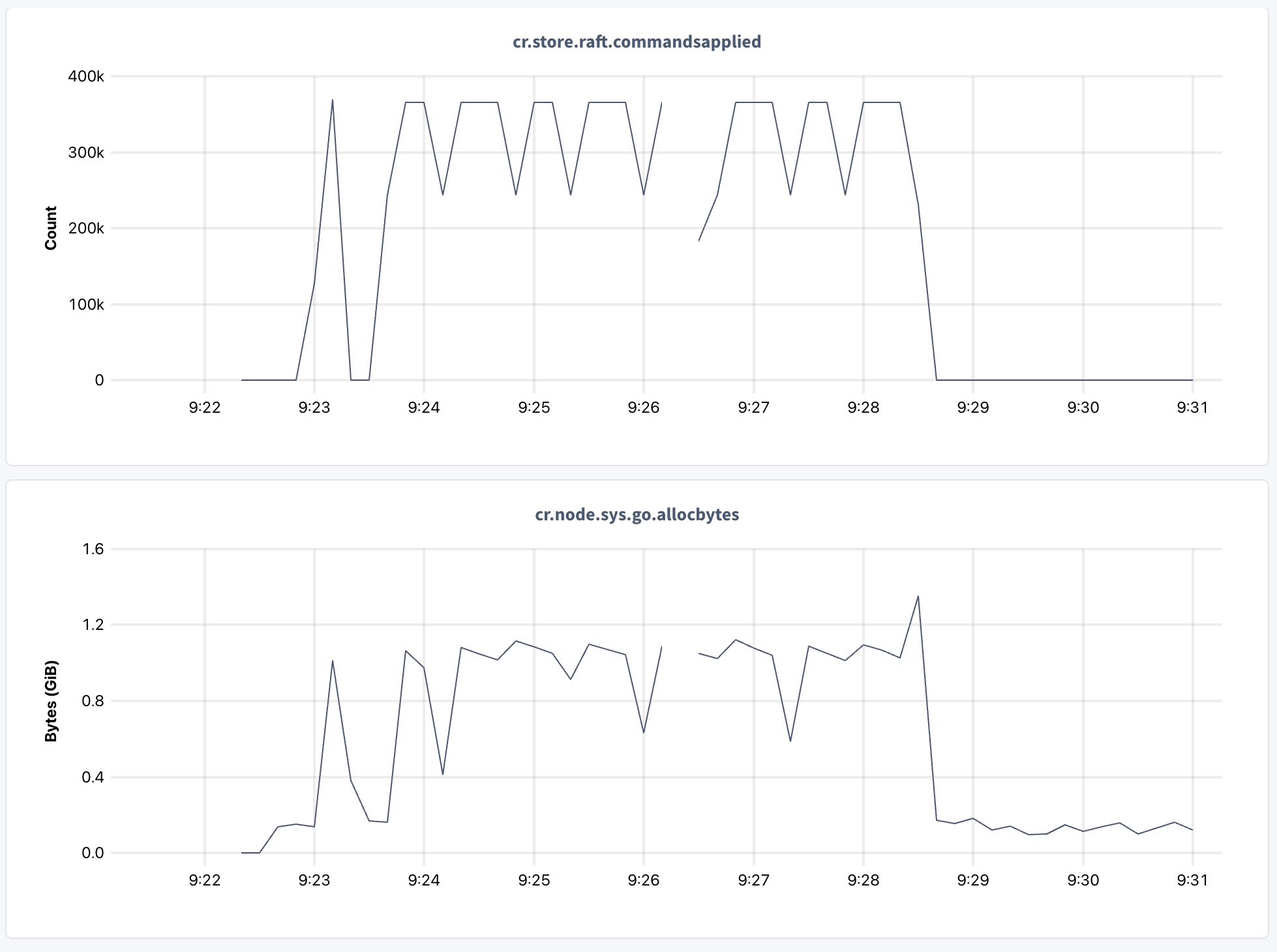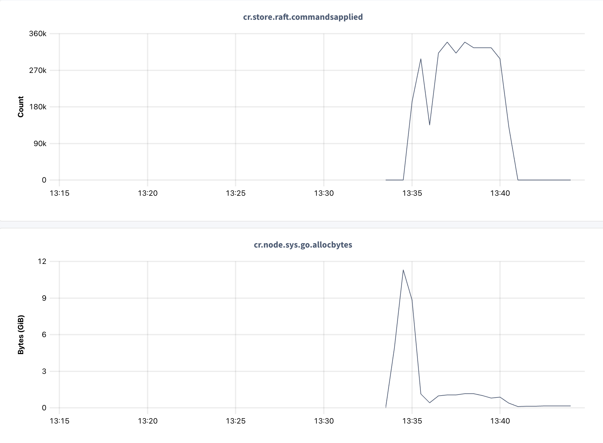 raft.hup()which reads all unapplied committed entries in order to check that there are no unapplied config changes. This PR paginates this scan so that the spike is limited toMaxCommittedSizePerReady. It also terminates the scan early if a config change has been found.An example effect of this change can be seen below (memory usage in CockroachDB). Before, there was a large spike to 12 GiB: