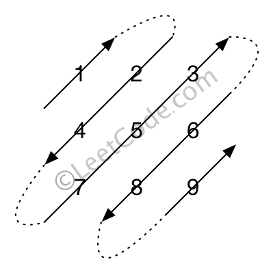 Given a matrix of M x N elements (M rows, N columns), return all elements of the matrix in diagonal order as shown in the below image.