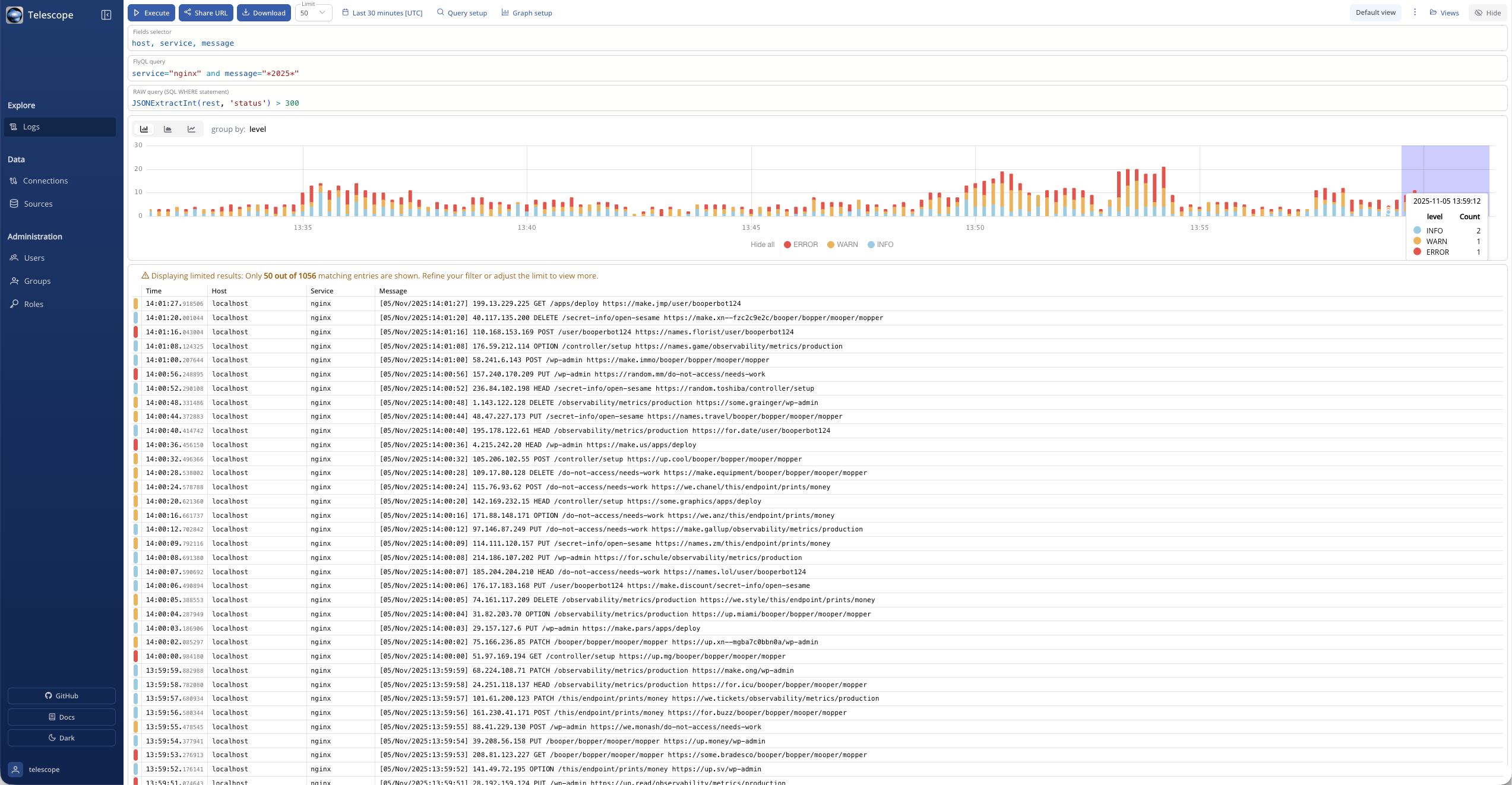 Telescope is a web application designed to provide an intuitive interface for exploring log data. It supports multiple types of sources, including ClickHouse and Docker. Users can configure connections to their ClickHouse databases or access container logs via the Docker API. Telescope provides a unified querying experience across different source types, allowing users to filter, search, and analyze logs efficiently. While ClickHouse remains the primary backend for structured log storage, Docker support offers a convenient option for local development or ephemeral environments. Future versions may further extend source support.