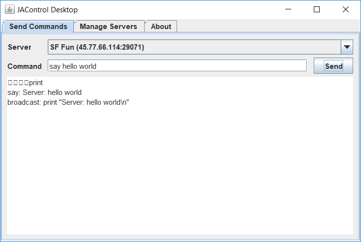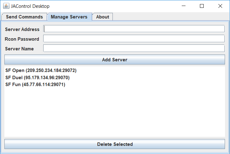 This is an application for sending rcon commands to Jedi Academy servers without going in game. Added servers will be synced using OneDrive for Windows. For other operating systems there is no automatic syncing capability but your data will persist between sessions.