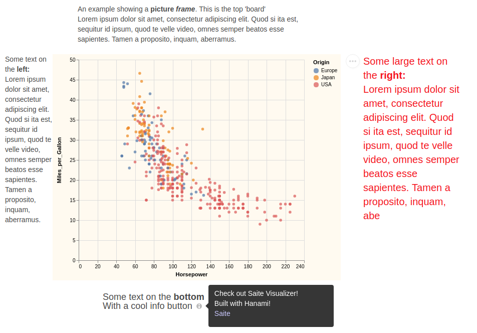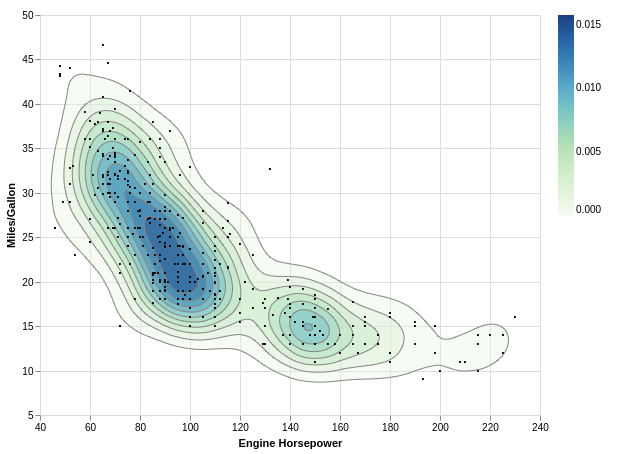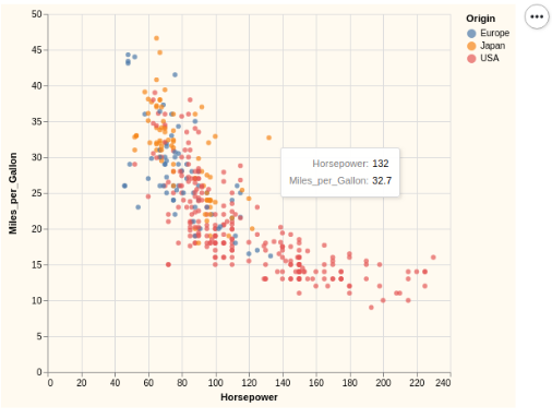 {:field "Miles_per_Gallon", :type "quantitative"}]}}When rendered, both the Altair code and Hanami template, result in the following visualization, where the mouse is hovering over the point given by [132, 32.7]: