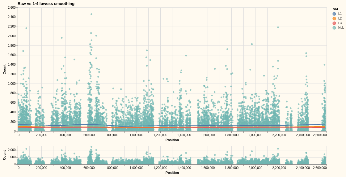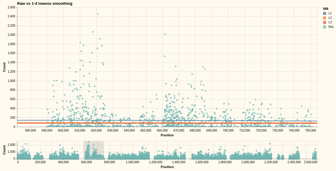 :COLOR "NM" :XTITLE "Position", :YTITLE "Count")])Here are two snapshots of the resulting interactive visualization: