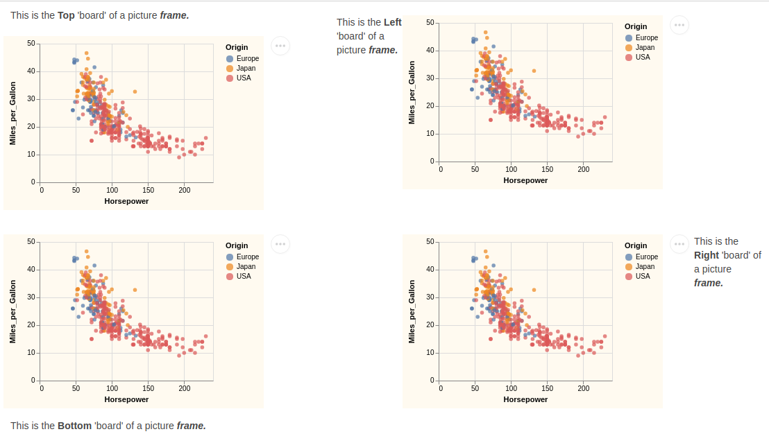 As a first example let's compare a Hanami template with corresponding Altair code. This is a the typical scatter plot example from the Vega-Lite developers used in many tutorials and by others in various places. First, the Altair: