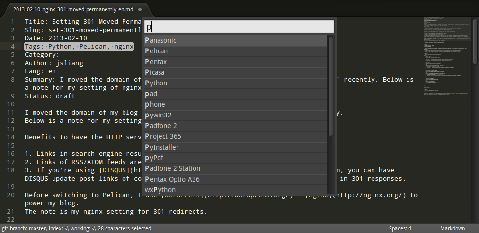 SublimePelican is a Sublime Text plugin that makes writing Pelican articles easier and faster.