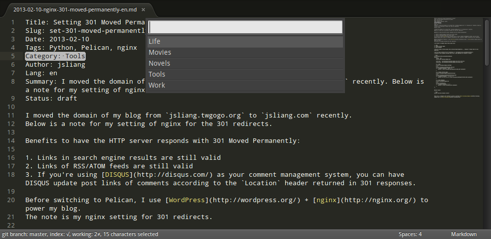 If you think it's hard to remember what categories you've used when writing articles, then this command is made for you. This command lists categories you've used in your Pelican site in the quick panel, allowing you to fuzzily select and insert a previously used category quickly.