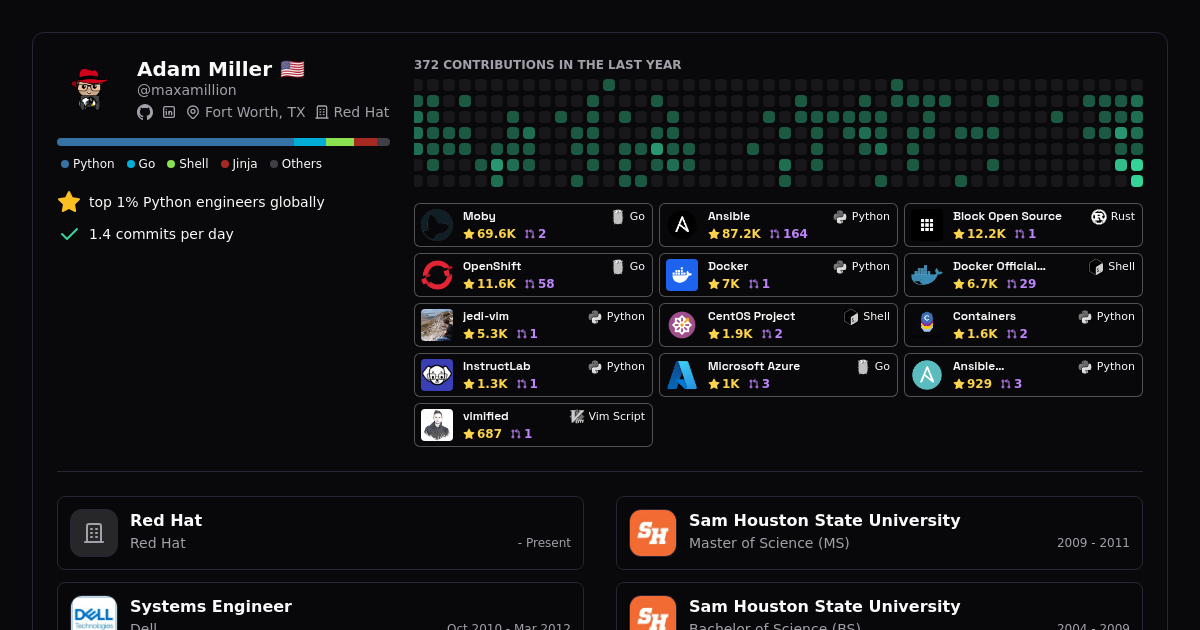I have a long history of contributing to open source including, but not limited to, projects such as Fedora [1], Ansible, CentOS, and Ramalama.