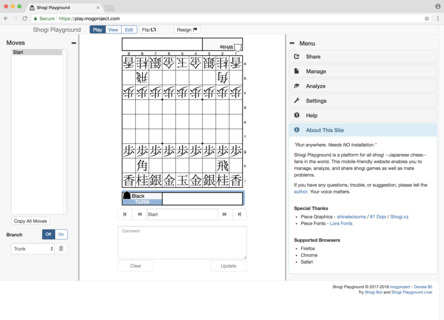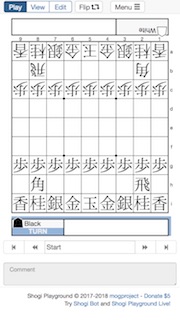Shogi Playground is a lightweight, mobile-friendly website where anyone can manage, analyze, and share shogi games as well as mate problems. Without any installation --other than an HTML5-compatible web browser, Shogi Playground provides an out-of-the-box online shogi board with which one can play around. The look and feel will be optimized for your screen. For example, more panels will be shown on a PC, and you can just flick your finger to move a piece on a mobile screen.