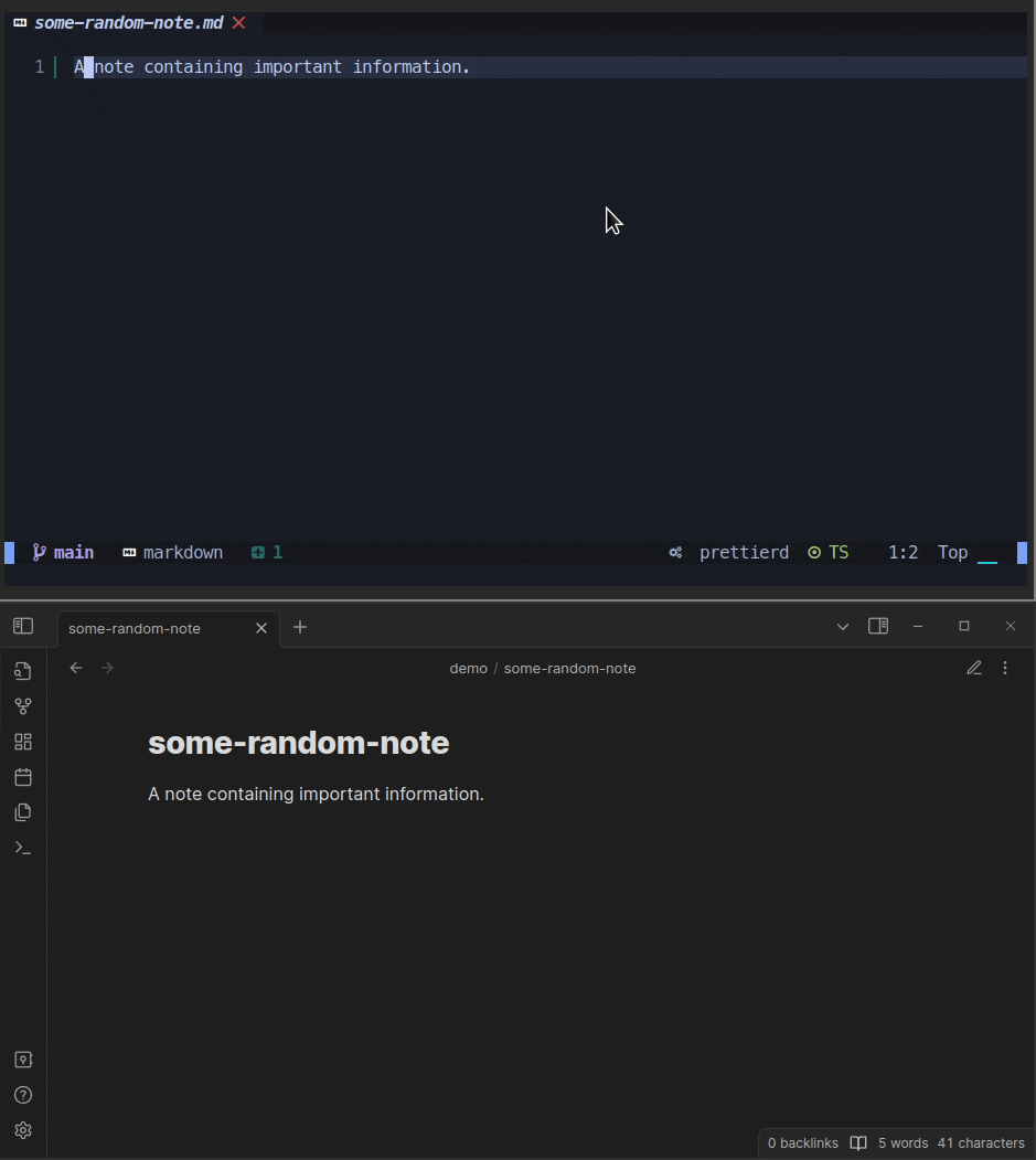Obsidian is great, but it doesn't offer the first-class Neovim experience that some of us just can't seem to do without. In the scenario where we edit notes in Neovim and view them rendered in Obsidian we would also like Obsidian to automatically follow navigation we do on the Neovim side.